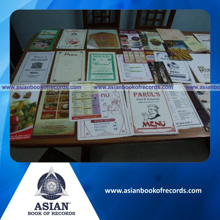 The Highest Number of Hotel Menu Cards Collected by an Individual (Female) was achieved by Shubangi Apte, Raipur, Chhattisgarh, India on March 31, 2010. It counted to 2815 hotel menu cards.