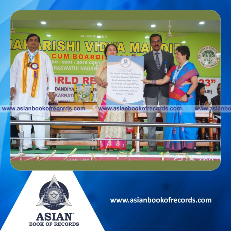 The Highest Number of Participants Performing Karnataka Folk Dance Simultaneously (Single Venue) was achieved by Maharishi Vidya Mandir Senior Secondary School, Hosur, Tamil Nadu, India on February 17, 2023. It counted to 948 participants.