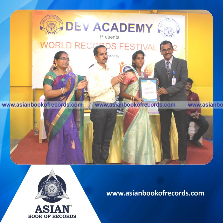 The Highest Number of Yogasanas Performed by an Individual (Female) in 20 Minutes was achieved by S.Sindhu, Student of Dev Academy, in Nerkundram, Chennai District, Tamil Nadu, India on August 28, 2022. It counted to 193 yogasanas.