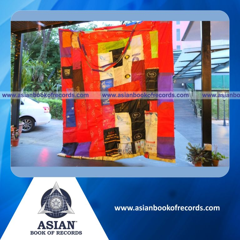 The Largest Bag made with Non-Woven Bags by a Team was achieved by MacSham at Hotel Re!, Singapore on September 1, 2017. It measured 112.96 square feet (9.84 feet in length and 11.48 feet in breadth).