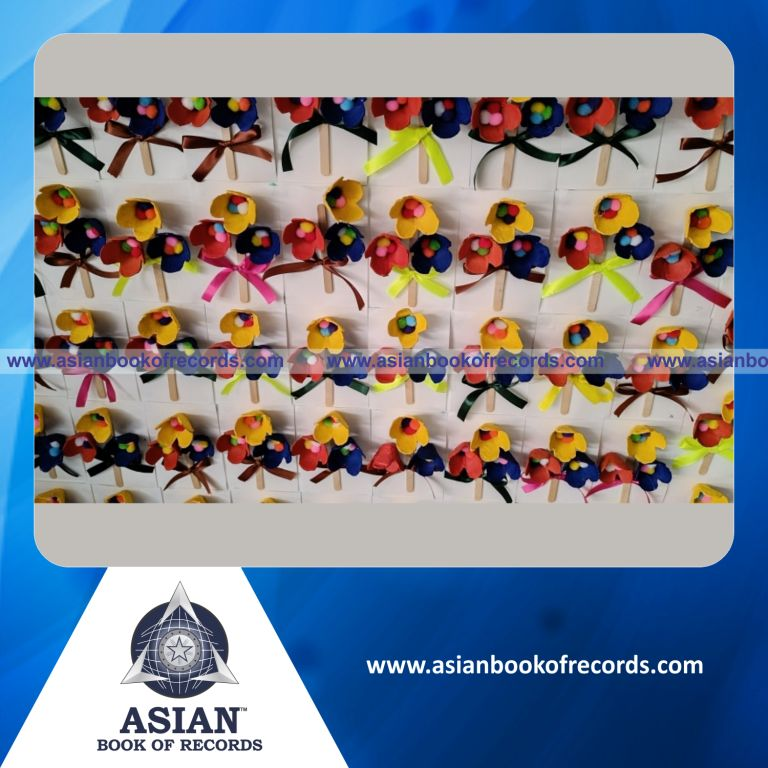 The Largest Display of Flowers Made From Egg Cartons was achieved by Sree Narayana Mission Nursing Home in Singapore on May 31, 2023. It measured 15.84 Square Meters (2.4m x 6.6m).