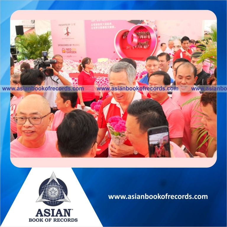 The Largest Distribution of Flowers to Mothers in Multiple Venues was achieved by PM Lee, Sian Chay Medical Institution and supported by Ang Mo Kio GRC and Sengkang SMC, Singapore on May 14, 2017. It counted to 116,000 silk flowers distributed in 70 locations.