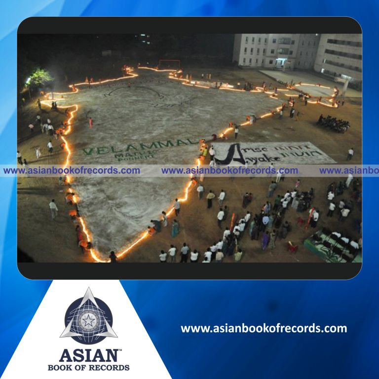 The Largest Flaming Image made with Mud Lamps by a Team was achieved by 66 students of Velammal Matriculation Higher Secondary School, Panchetti, Tamil Nadu, India on August 14, 2012. It counted to 15,200 mud lamps.