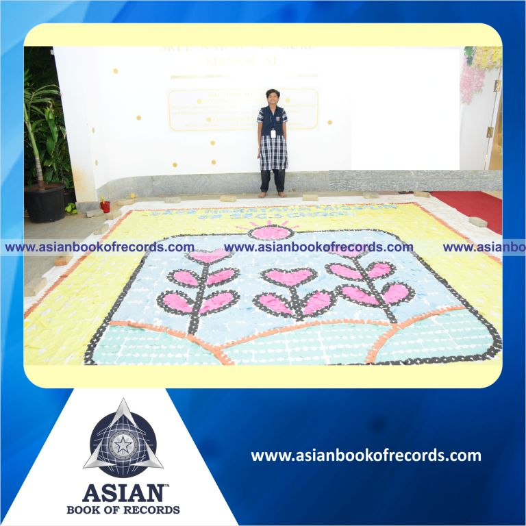 The Largest Kirigami Mosaic by an Individual (Minor-Female) was achieved by Sankhya.P, Grade VII A, Sree Narayana Mission Senior Secondary School in Chennai District, Tamil Nadu, India on September 28, 2023. It measured 169.23 square feet (13.94 feet in length and 12.14 feet in breadth).