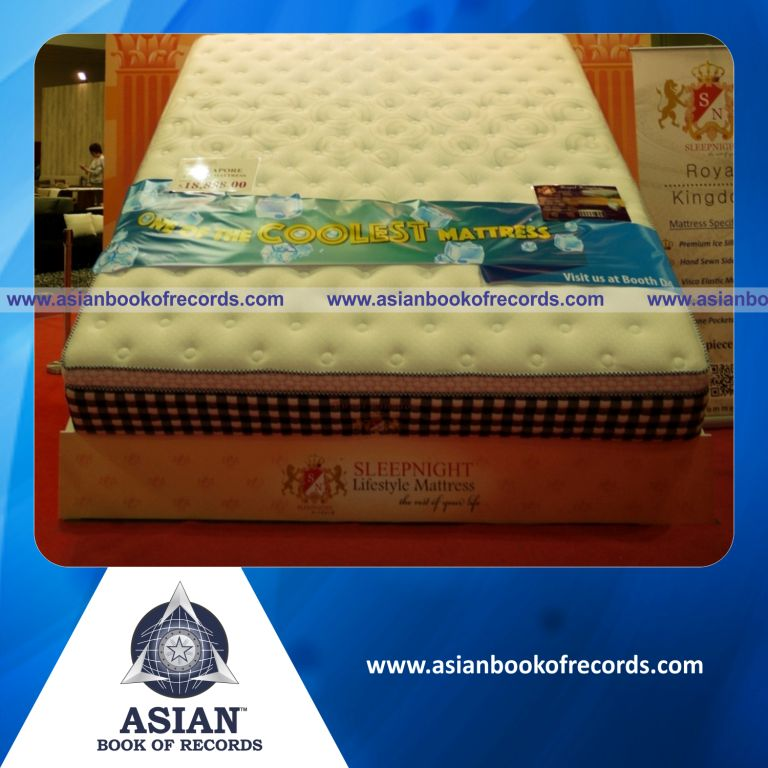 The Largest Mattress was achieved by Asia Pacific Furniture Fair at MBS, Singapore on July 11, 2015. It measured 86.75 square feet (10.17 feet in length and 8.53 feet in breadth), 1.64 feet in height and weighed 158 kilograms.