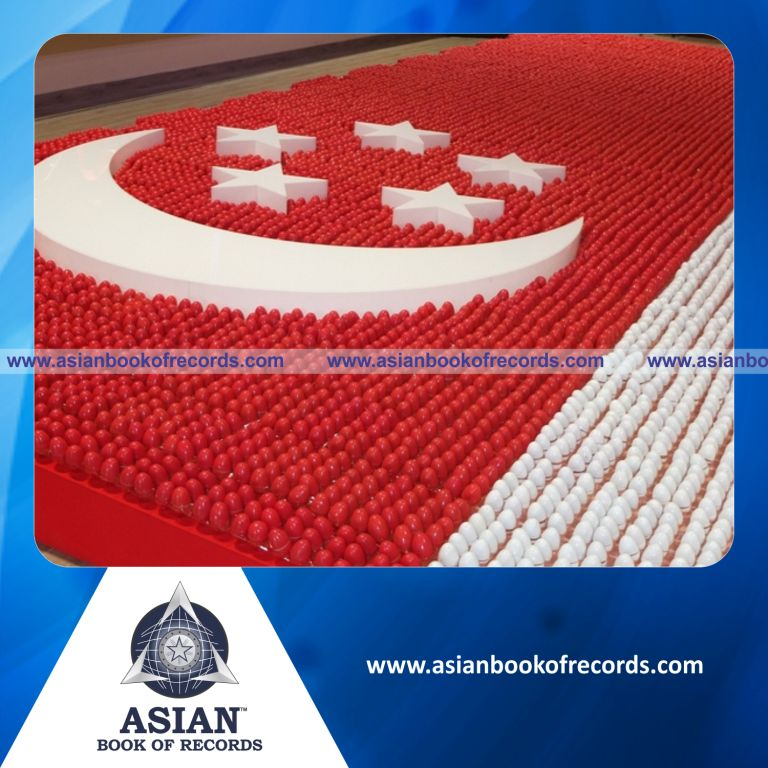 The Largest National Flag made of Eggs was achieved by Radin Mas CC at Telok Blangah Crescent, Singapore on August 9, 2018. It measured 6 meters in breadth and 9.1 meters in length.