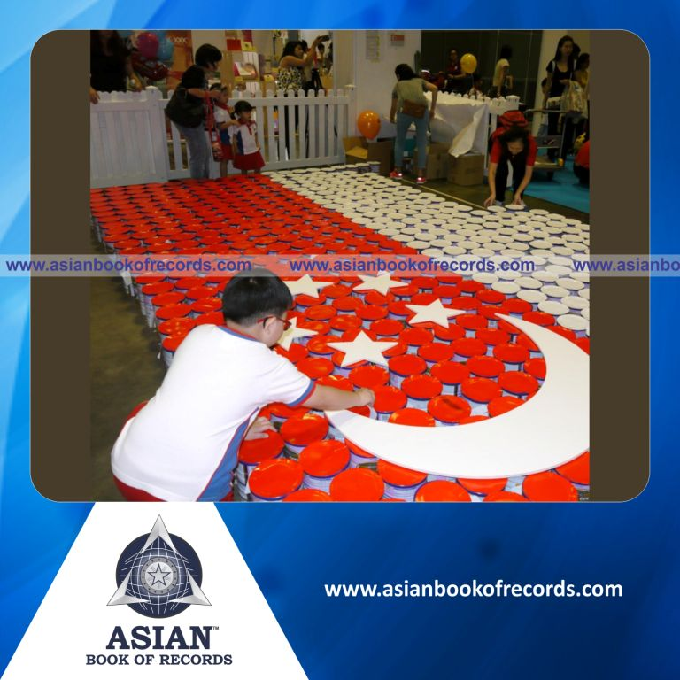The Largest National Flag made of Milk Tins was achieved by Wyeth Nutrition at Suntec City, Singapore between August 12, 2016 and August 14, 2016. It measured 165.38 square feet (10.50 feet in length and 15.75 feet in breadth).