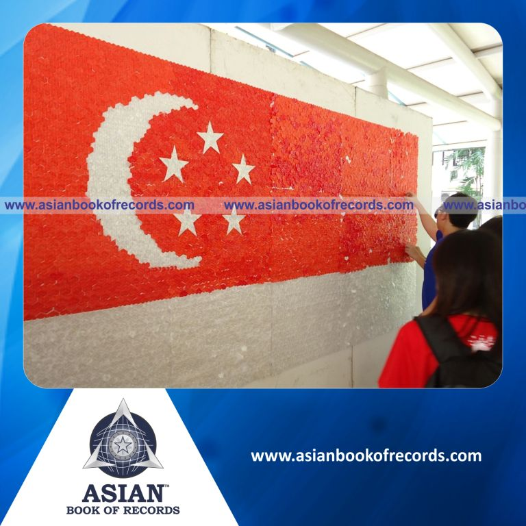 The Largest National Flag made of Straw Hearts was achieved by Geylang Serai CC YEC members and Maris Stella High School at Upper Aljunied Lane, Singapore on July 19, 2014. It measured 64.55 square feet (9.84 feet in length and 6.56 feet in breadth).