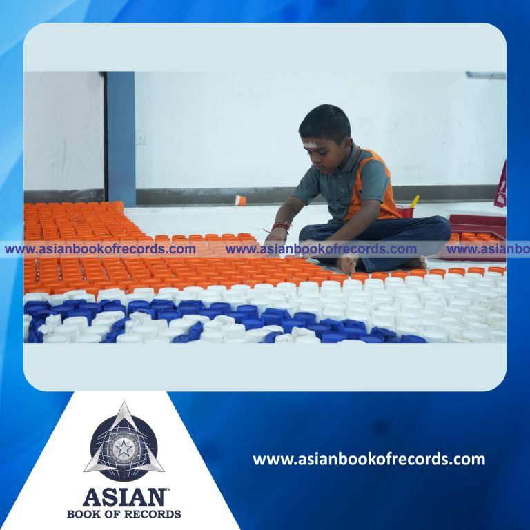 The Largest National Flag made with Paper Cups by an Individual (Minor-Male) was achieved by Sivasalapathi Abinav.K, Grade IV, The Frontline Academy in Tirupur District, Tamil Nadu, India between July 20, 2023 and July 22, 2023. It measured 581.15 square feet (29.53 feet in length and 19.68 feet in breadth).