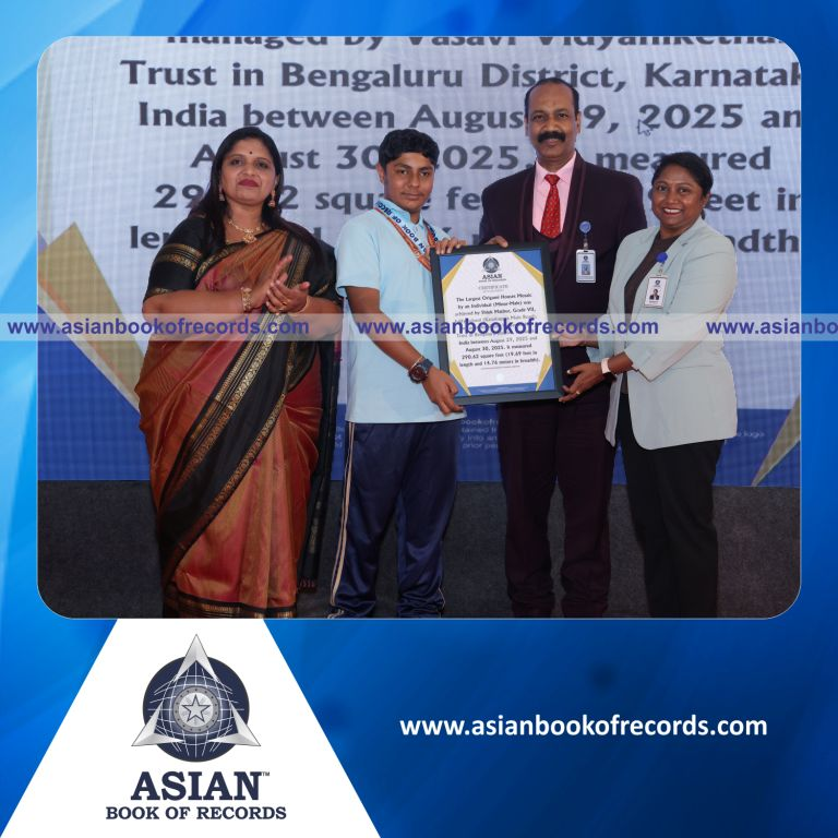 The Largest Origami Houses Mosaic by an Individual (Minor-Male) was achieved by Shlok Mathur, Grade VII, Edify School (Kanakapura Main Road), managed by Vasavi Vidyanikethan Trust in Bengaluru District, Karnataka, India between August 29, 2025 and August 30, 2025. It measured 290.62 square feet (19.69 feet in length and 14.76 meters in breadth).