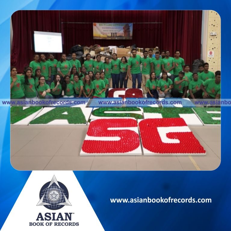 The Largest Text Made of Bottle Caps was achieved by Singapore Youth Group of Rajayoga Power Transcendental Meditation Society at Singapore on November 24, 2019. It measured 6.3 meters in length and 4.7 meters in breadth which was made with 10,590 plastic bottles.