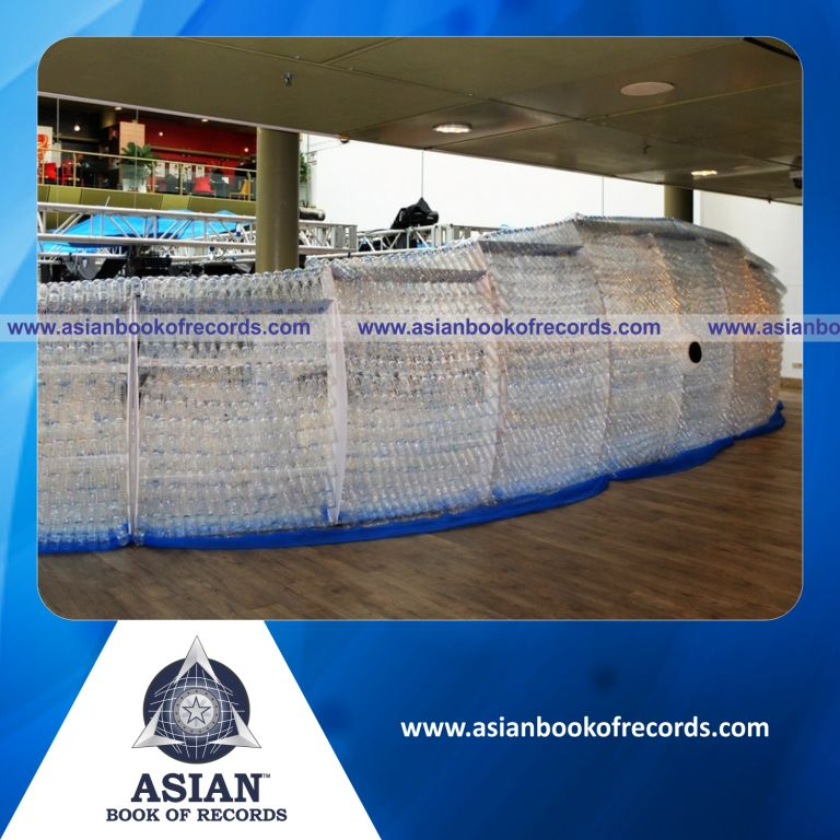 The Largest Theatrical Prop made with Plastic Bottles was achieved by ArtBeatz at Far East Square, Singapore between July 05, 2017 and July 30, 2017. It measured 108.92 feet in length and 7.22 feet in height.