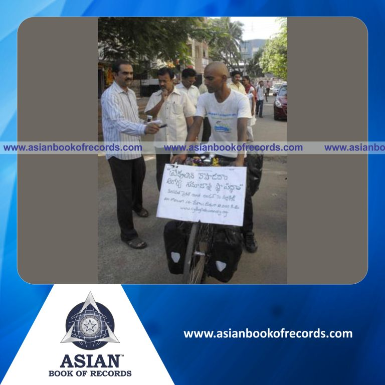 The Longest Distance of Bicycle Riding by an Individual (Male) was achieved by Srinivasa Chowdary Alluri starting from London and ending at Delhi, India between June 25, 2011 and October 2, 2011. It covered a distance of 11,350 kilometers in 109 days