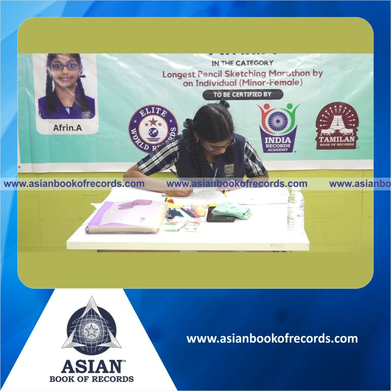 The Longest Pencil Sketching Marathon by an Individual (Minor-Female) was achieved by Afrin.A, Grade VII A, Sree Narayana Mission Senior Secondary School in Chennai District, Tamil Nadu, India on October 2, 2023. It lasted for 13 hours.