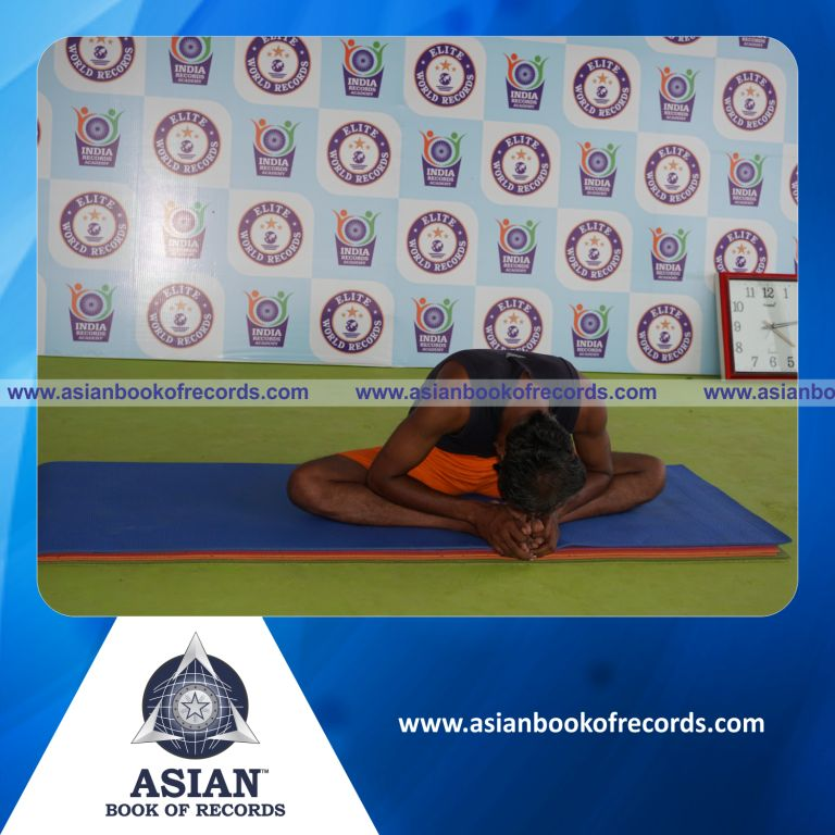 The Longest Time Holding Baddha Konasana Yoga Pose Blindfolded by an Individual (Male) was achieved by Dr.V.Gunasekaran, Founder-Maragatham Yogalayam at Udumalpet, Tirupur District, Tamil Nadu, India on September 26, 2019. It lasted for 3 Minutes and 2 Seconds.