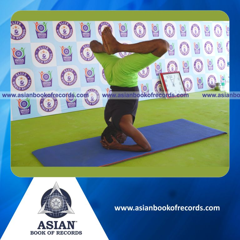 The Longest Time Holding Baddha Sirsasana Yoga Pose by an Individual (Male) was achieved by Dr.V.Gunasekaran, Founder-Maragatham Yogalayam at Udumalpet, Tirupur District, Tamil Nadu, India on September 15, 2019. It lasted for 3 Minutes.