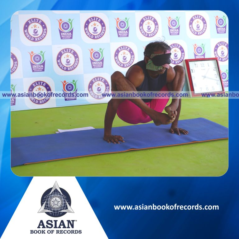 The Longest Time Holding Bhujapidasana Yoga Pose Blindfolded by an Individual (Male) was achieved by Dr.V.Gunasekaran, Founder-Maragatham Yogalayam at Udumalpet, Tirupur District, Tamil Nadu, India on September 21, 2019. It lasted for 3 Minutes and 3 Seconds.