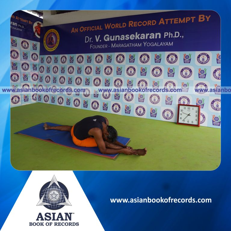 The Longest Time Holding Daksina Hanumana Paschimottanasana Yoga Pose by an Individual (Male) was achieved by Dr.V.Gunasekaran, Founder-Maragatham Yogalayam at Udumalpet, Tirupur District, Tamil Nadu, India on September 26, 2019. It lasted for 3 Minutes and 2 Seconds.