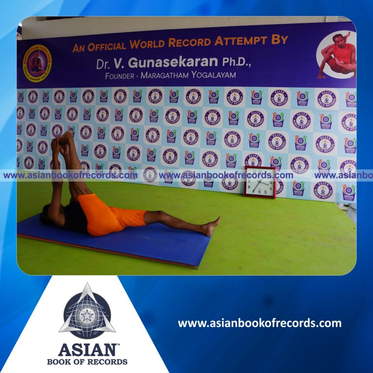 The Longest Time Holding Daksina Julasana Yoga Pose Blindfolded by an Individual (Male) was achieved by Dr.V.Gunasekaran, Founder-Maragatham Yogalayam at Udumalpet, Tirupur District, Tamil Nadu, India on September 26, 2019. It lasted for 3 Minutes and 2 Seconds.