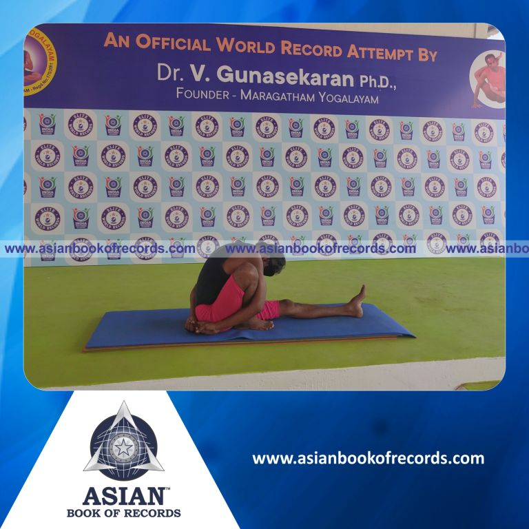 The Longest Time Holding Daksina Marichyasana Yoga Pose Blindfolded by an Individual (Male) was achieved by Dr.V.Gunasekaran, Founder-Maragatham Yogalayam at Udumalpet, Tirupur District, Tamil Nadu, India on September 26, 2019. It lasted for 4 Minutes and 4 Seconds.