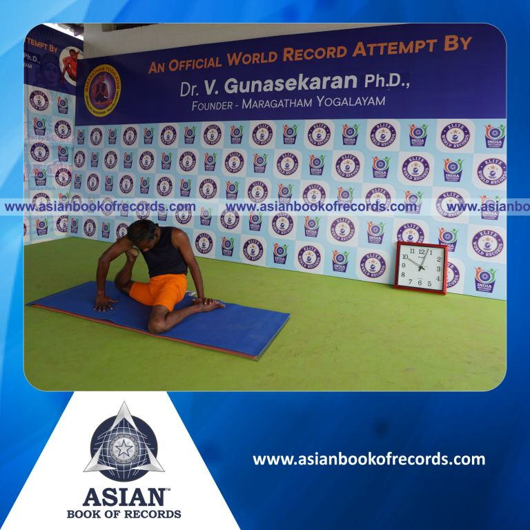 The Longest Time Holding Daksina Mrigasana Yoga Pose by an Individual (Male) was achieved by Dr.V.Gunasekaran, Founder-Maragatham Yogalayam at Udumalpet, Tirupur District, Tamil Nadu, India on September 26, 2019. It lasted for 3 Minutes and 2 Seconds.