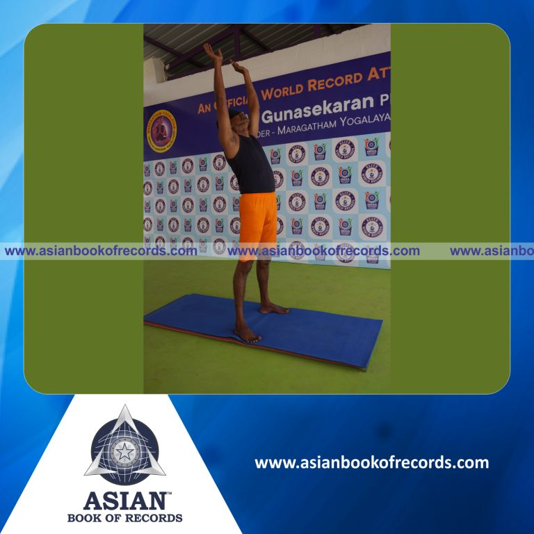 The Longest Time Holding Piraiasana Yoga Pose Blindfolded by an Individual (Male) was achieved by Dr.V.Gunasekaran, Founder-Maragatham Yogalayam at Udumalpet, Tirupur District, Tamil Nadu, India on September 26, 2019. It lasted for 3 Minutes and 2 Seconds.