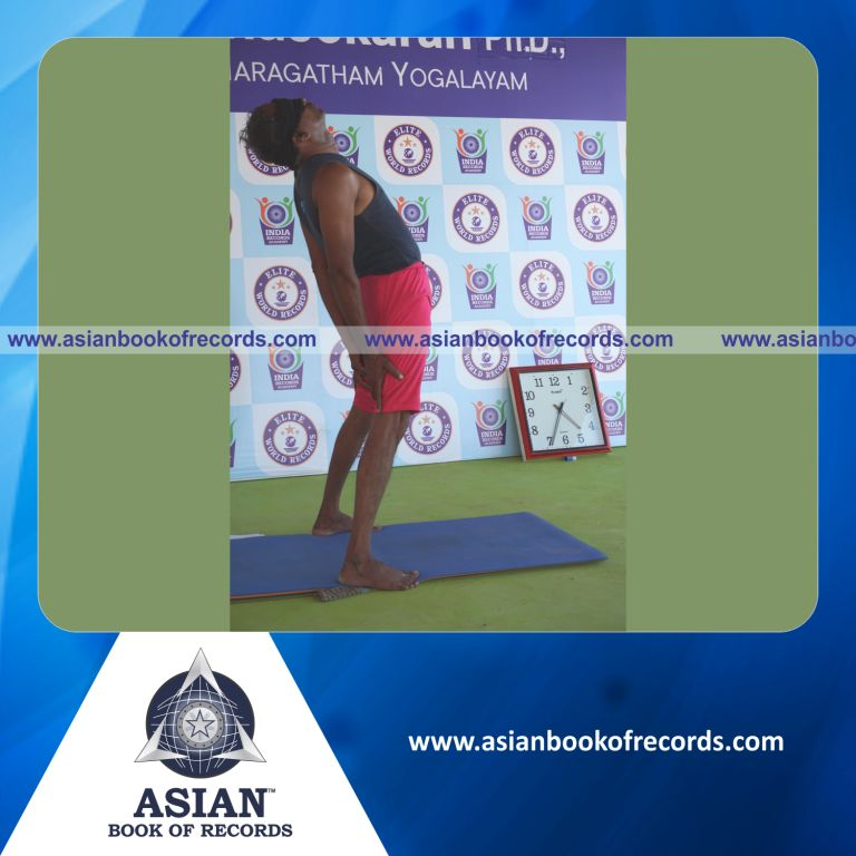 The Longest Time Holding Trianga Mukthasana Yoga Pose Blindfolded by an Individual (Male) was achieved by Dr.V.Gunasekaran, Founder-Maragatham Yogalayam at Udumalpet, Tirupur District, Tamil Nadu, India on September 21, 2019. It lasted for 3 Minutes and 5 Seconds.