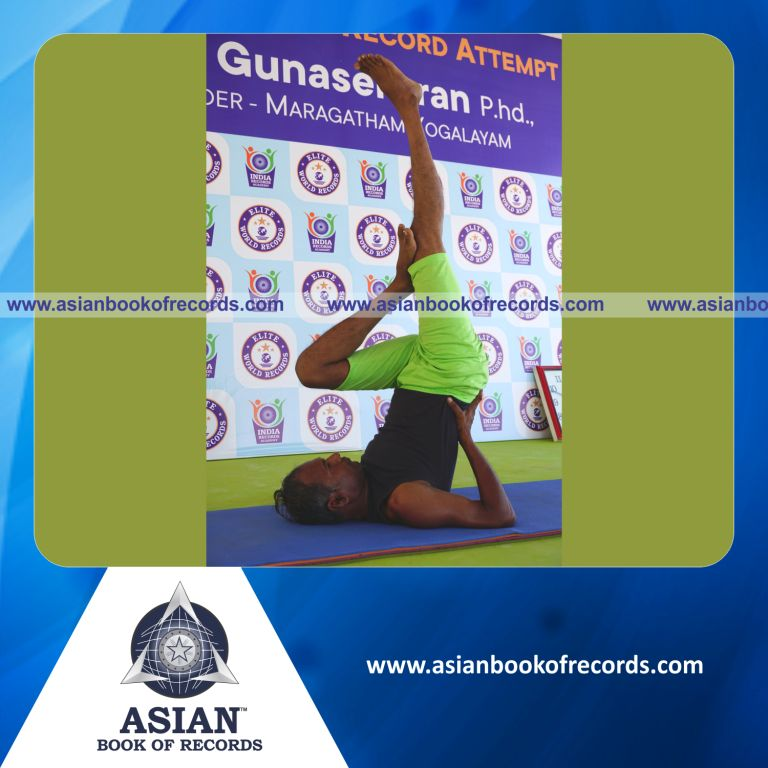 The Longest Time Holding Vama Ardha Sarvangasana Yoga Pose by an Individual (Male) was achieved by Dr.V.Gunasekaran, Founder-Maragatham Yogalayam at Udumalpet, Tirupur District, Tamil Nadu, India on September 15, 2019. It lasted for 4 Minutes.