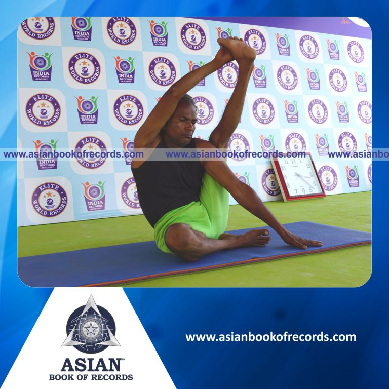 The Longest Time Holding Vama Purna Krounchasana Yoga Pose by an Individual (Male) was achieved by Dr.V.Gunasekaran, Founder-Maragatham Yogalayam at Udumalpet, Tirupur District, Tamil Nadu, India on September 15, 2019. It lasted for 3 Minutes.