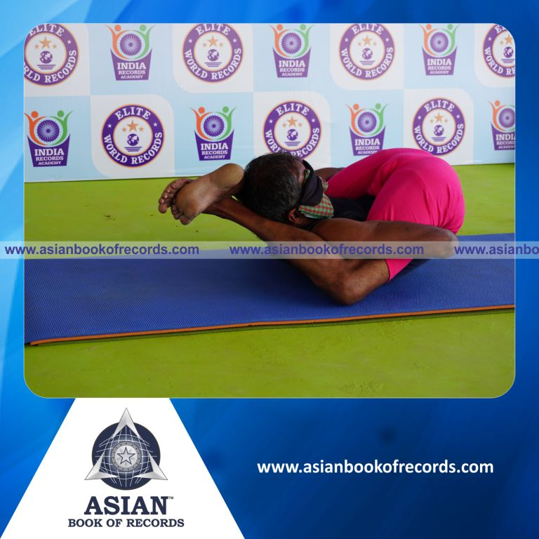 The Longest Time Holding Yoganidrasana Yoga Pose Blindfolded by an Individual (Male) was achieved by Dr.V.Gunasekaran, Founder-Maragatham Yogalayam at Udumalpet, Tirupur District, Tamil Nadu, India on September 21, 2019. It lasted for 4 Minutes and 5 Seconds.