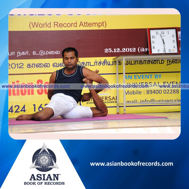 The Longest Yoga Marathon by an Individual (Male) was achieved by V.Gunasekaran of "Maragatham Yogalayam" at Indian Medical Association (IMA) Hall, Udumalpet, Tirupur District, Tamil Nadu, India between December 25, 2012 and December 27, 2012. It lasted for 43 hours.
