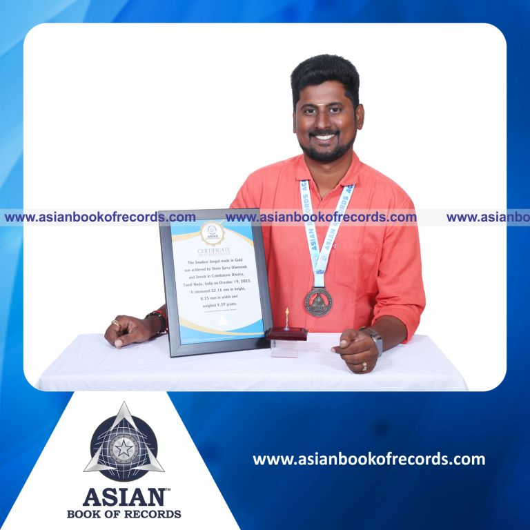 The Smallest Sengol made in Gold was achieved by Shree Sarva Diamonds and Jewels in Coimbatore District, Tamil Nadu, India on October 19, 2023. It measured 52.16 mm in height, 8.25 mm in width and weighed 9.39 grams.