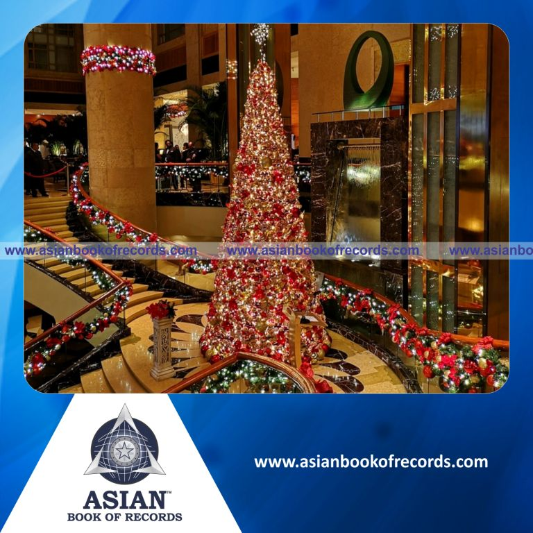 The Tallest Christmas Tree Made of Teddy Bears was achieved by Fullerton Hotel at Singapore on November 23, 2018. It measured 5 meters in height made with 450 fullerton bears .